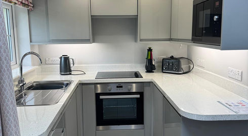 The open plan living and kitchen area, which leads onto a patio area via French doors, has been completely refurbished. The bedroom sleeps two in either a twin beds or a super king size arrangement. The showeroom is modern & bright..